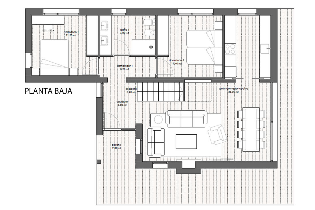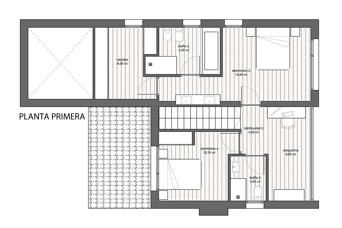 El salón, la cocina, así como la salita de estar en la galería de la primera planta y la habitación principal están orientados al sur. El resto de los dormitorios salvo el pequeño de la primera planta lo están hacia el este. Todos los huecos contarán con unos grandes ventanales con vidrios de seguridad. La casa dispone de aislamiento con gran espesor y calidad de modo que las pérdidas de energía serán mínimas y el confort alto.
